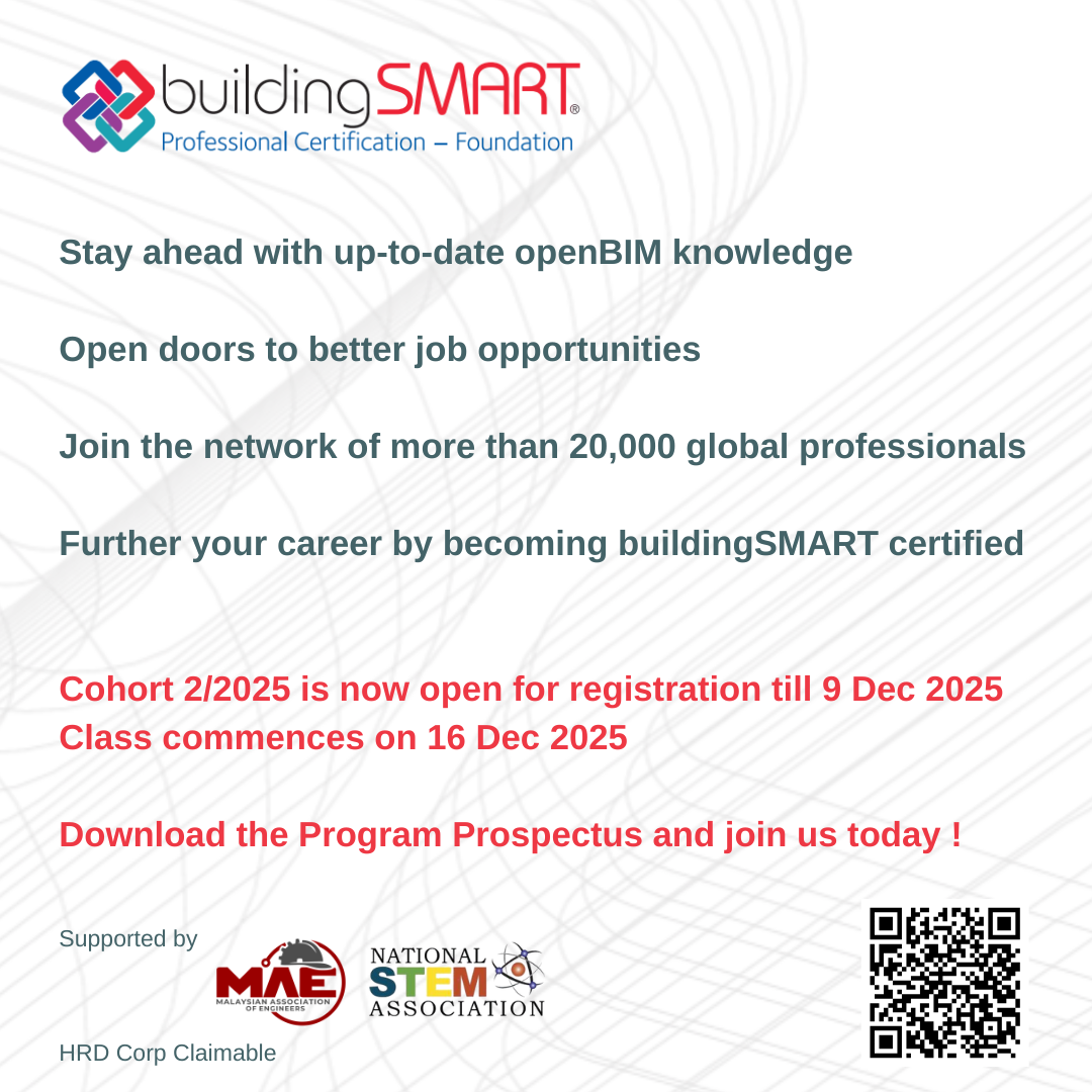 - RM5,000/pax all-in; inclusive of buildingSMART Professional Certification – Foundation exam fee.