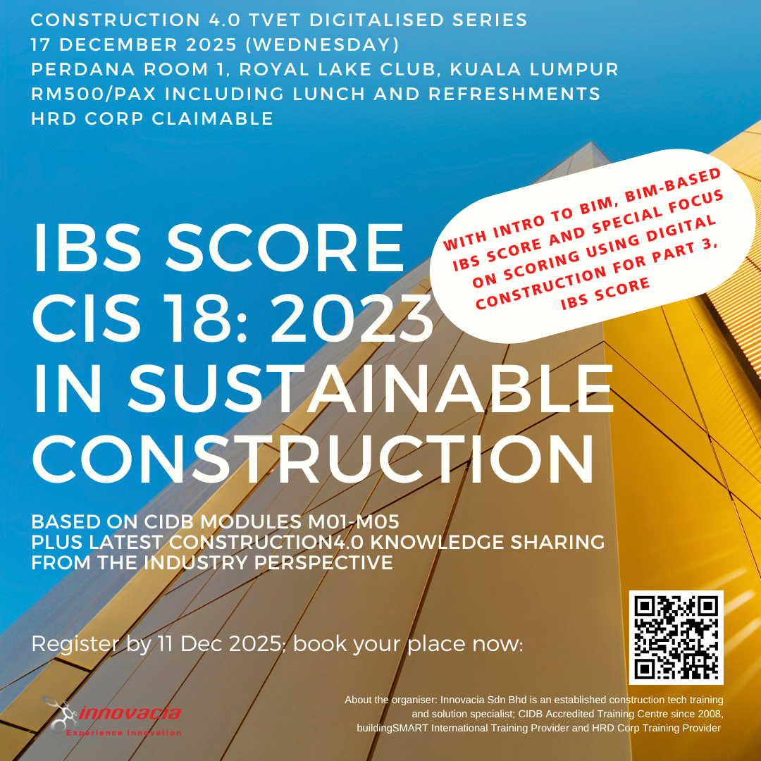 - Compute IBS Score manually and able to plan and strategise; in reference to the latest standards, CIS 18:2023 and MS1064 : 2018 with focus on Digital Construction